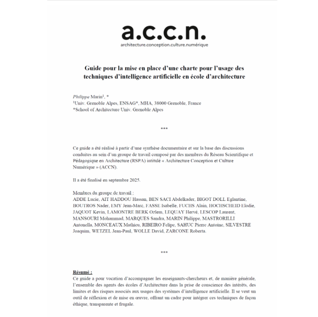 Ce guide a pour vocation d’accompagner les enseignants-chercheurs et, de manière générale, l’ensemble des agents des écoles d’Architecture dans la prise de conscience des intérêts, des limites et des risques associés aux usages des systèmes d’intelligence artificielle. Il se veut un outil de réflexion et de mise en œuvre, offrant un cadre pour intégrer ces techniques de façon